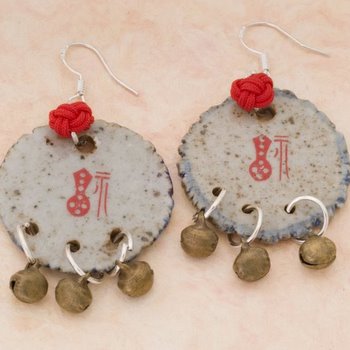 These circular earrings are definitely one of a kind! These earrings have an ancient Chinese symbol on the center along a red knot on the top and with three tiny bells on the bottom, you're sure to catch anybody's attention.