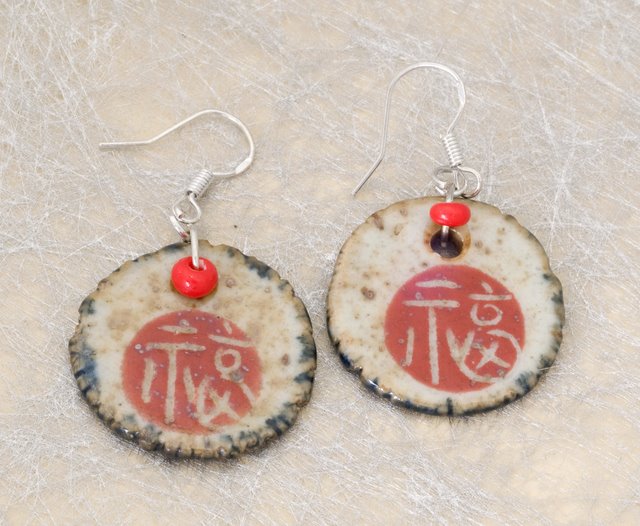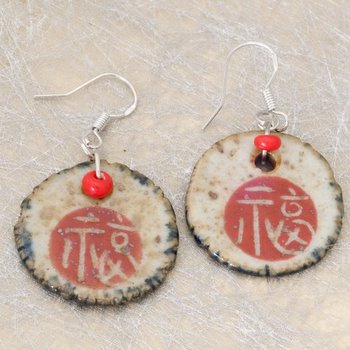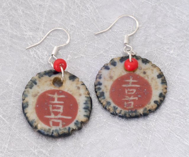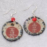 These circular earrings are definitely one of a kind! These earrings have the Chinese character for either Good Luck or Double Happiness on the center.