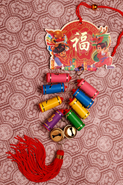 With lots of different colors to brighten your entry way, you'll want to hang this beautiful firecracker decoration on your door to celebrate the Chinese New Year. The Chinese character "Fu - Good Luck" and a more contemporary design of the two lucky children top off this great hanging that can be used year after year.