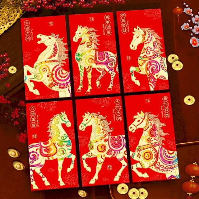 A set of red envelopes designed for the Year of the Horse. Each envelope features festive horse artwork and traditional decorative patterns in red and gold tones. Suitable for gifting money during Lunar New Year celebrations or other occasions, these envelopes provide a simple and themed way to share good wishes for the new year.