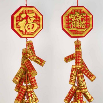 This big firecracker wall hanging is topped with a traditional Chinese knot and finished with a tassel. The firecrackers are decorated with the Chinese characters "Fu" -- "Good Luck", "Zhao Cai Jin Bao"--"Fortune". Add this decoration to your New Years collection and hang it year after year to brighten your home or business and spirits for the New Year!