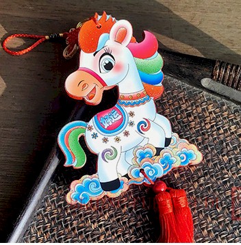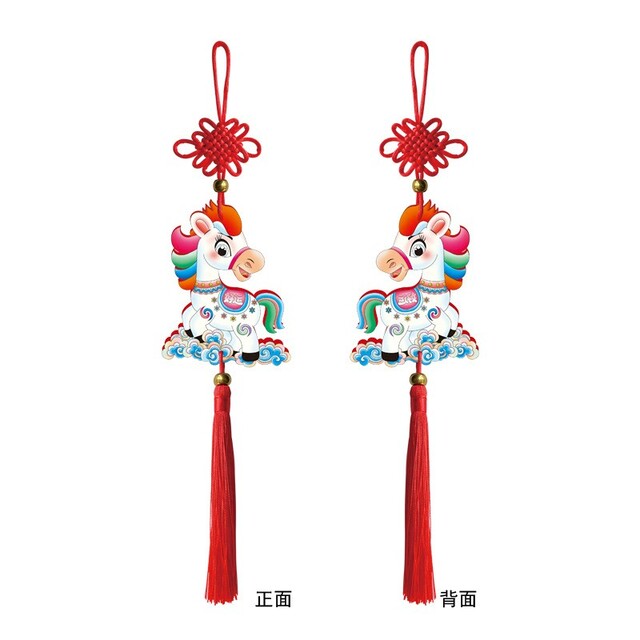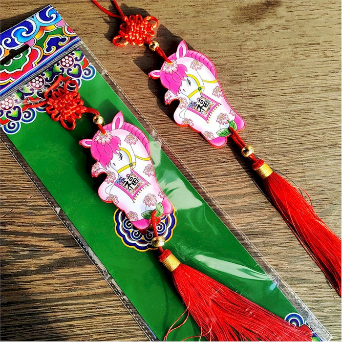 A decorative wooden wall hanging designed for the Year of the Horse. The piece features a stylized horse cut-out with layered wood tones and engraved details, combined with traditional festive motifs. It includes a string for easy hanging and is suitable for home, classroom, or seasonal displays celebrating the Lunar New Year.
