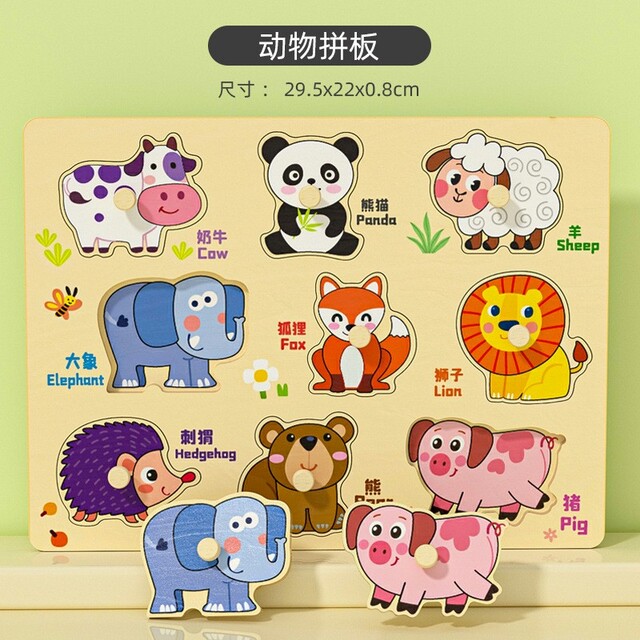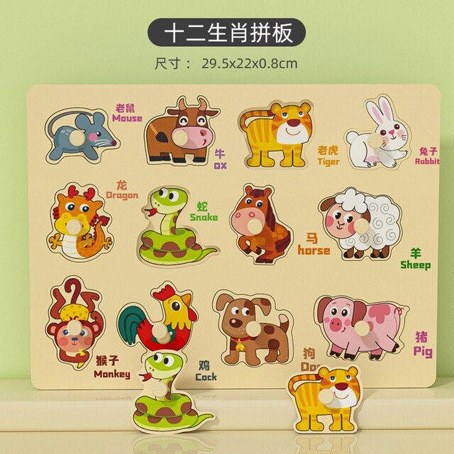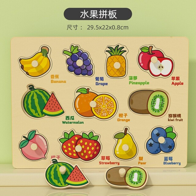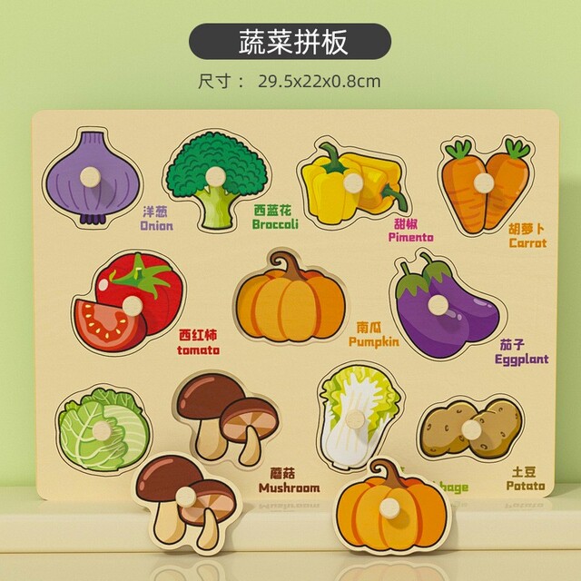 Children can learn the Chinese and English words for objects around the house, vegetables, fruits, shapes while playing with this colorful wooden peg puzzle. Each puzzle piece is a picture of an item normally found inside the house. This starter puzzle is great for expanding toddler vocabulary and developing matching skills.