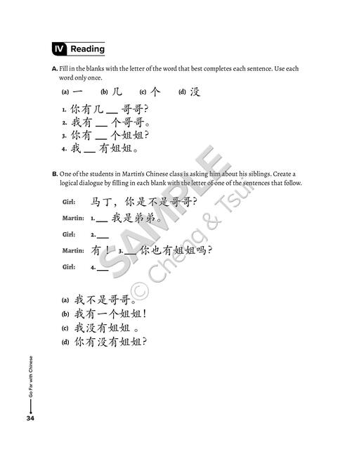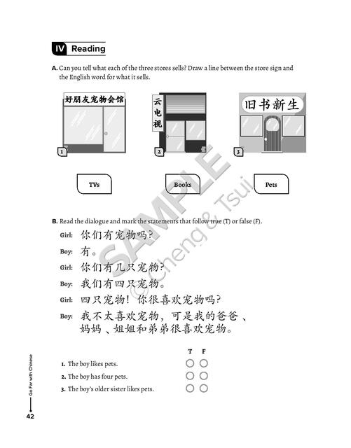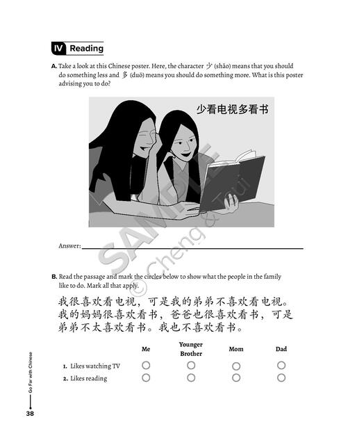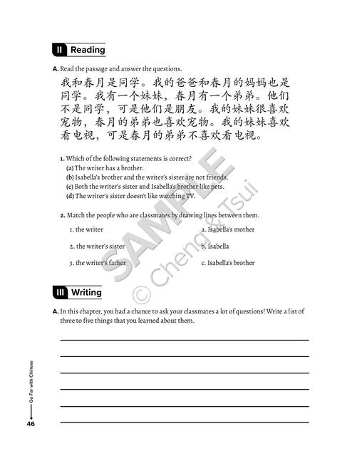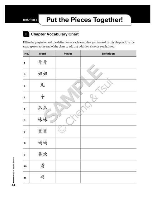 Designed to be used alongside the Textbook, the Go Far with Chinese Workbook offers numerous opportunities for students to reinforce their grasp of the new vocabulary and grammar in each Section of the Textbook. The Workbook includes:
