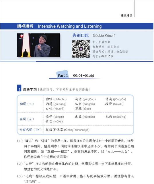 This set of materials is divided into six levels, each of which is composed of several themes, encompassing society, economy, culture, education, life, love, and art. Several course modules are designed under each theme. The intermediate level (I) includes 10 volumes, each taking 4 class hours and covering the communication functions and scenes commonly used in the elementary level, intermediate level and advanced level. Teachers can develop a personalized assortment of teaching materials based on the themes they are interested in, which can either be independently used in an audiovisual-speaking course, or as exercise materials in a comprehensive class, speaking class, listening class and other classes.