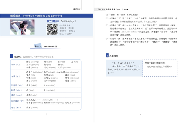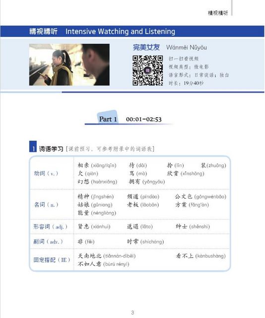该系列教材根据视听材料的难度分为6级,涵盖社会、经济、文化、教育、生活、爱情、艺术等多个主题,主题下设若干专题,每个专题独立成册。中级上首批出版10个分册,每册教学容量约4课时,语言方面覆盖初、中、高各级常用交际功能与场景。师生可根据需要自由组合感兴趣的专题内容形成个性化教材,既可用于独立开设的视听课程,也可作为视听教学材料用于综合课、口语课或听力课等课型。