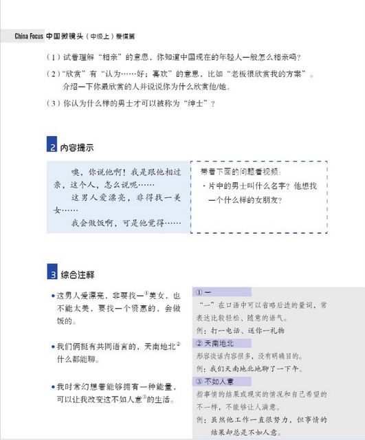 China Focus is a set of comprehensive Chinese teaching materials specially designed for the Chinese audiovisual-speaking course. The video clips are extracted from contemporary Chinese social hot issues, feature programs, news, sitcoms, documentaries, talk shows, interviews, entertainment programs, films and TV plays, micro films, advertisements, songs, etc. Using abundant online video resources, it builds a natural-language-based classroom teaching environment, giving full play to the Chinese audiovisual-speaking course's function of being a window to the society, and promoting the integration of language learning and cultural understanding.