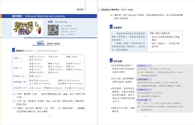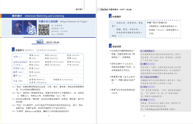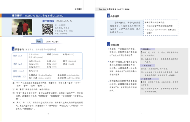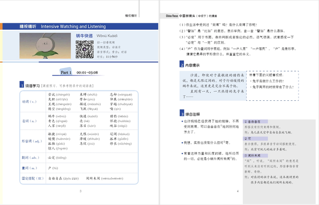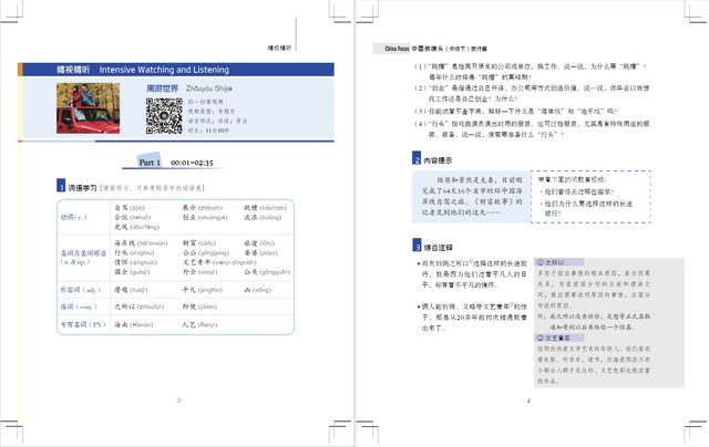 China Focus is a set of comprehensive Chinese teaching materials specially designed for the Chinese audiovisual-speaking course. The video clips are extracted from contemporary Chinese social hot issues, feature programs, news, sitcoms, documentaries, talk shows, interviews, entertainment programs, films and TV plays, micro films, advertisements, songs, etc. Using abundant online video resources, it builds a natural-language-based classroom teaching environment, giving full play to the Chinese audiovisual-speaking course's function of being a window to the society, and promoting the integration of language learning and cultural understanding.