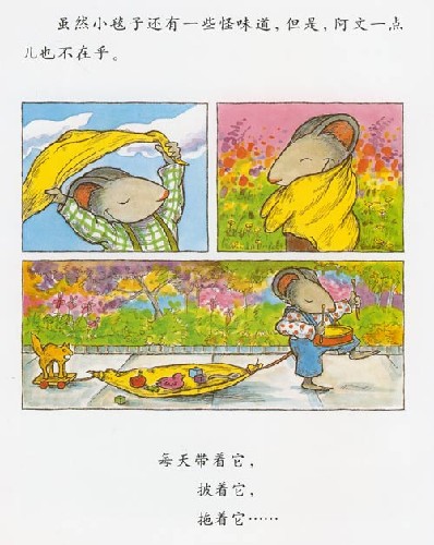 本故事是关于一只叫做阿文的小老鼠的,他有个习惯,无论是走路、吃饭、睡觉还是和其他小朋友玩时,都一定要带着他心爱的小毯子,有小毯子陪着阿文,他心里就很安稳,也不会整天都黏着妈妈和爸爸。但是,他慢慢长大,上小学了,他仍然不能离开小毯子。由于阿文太小而毯子太大,有一本书里还夸张地画了这个故事对比造型。阿文的妈妈爸爸觉得要改变这样的情况,既不让阿文过分地依赖小毯子,又不能让阿文感觉失去了小毯子,怎么办呢?终于,妈妈爸爸和阿文商量好,把小毯子剪下一块给阿文做了一块手绢,这样,阿文依然可以带着他的“小毯子”,但也能很好地与同学相处,适应学校的生活了。