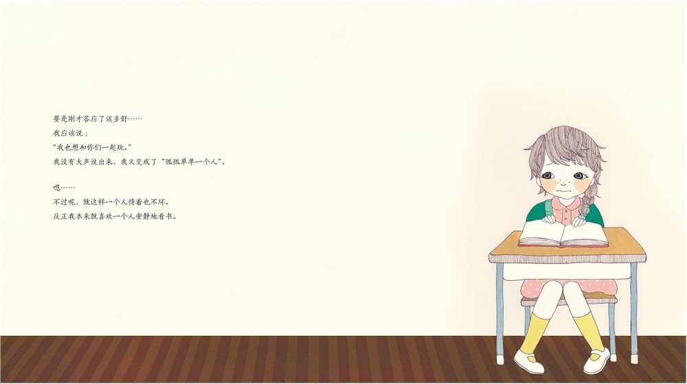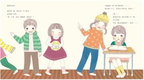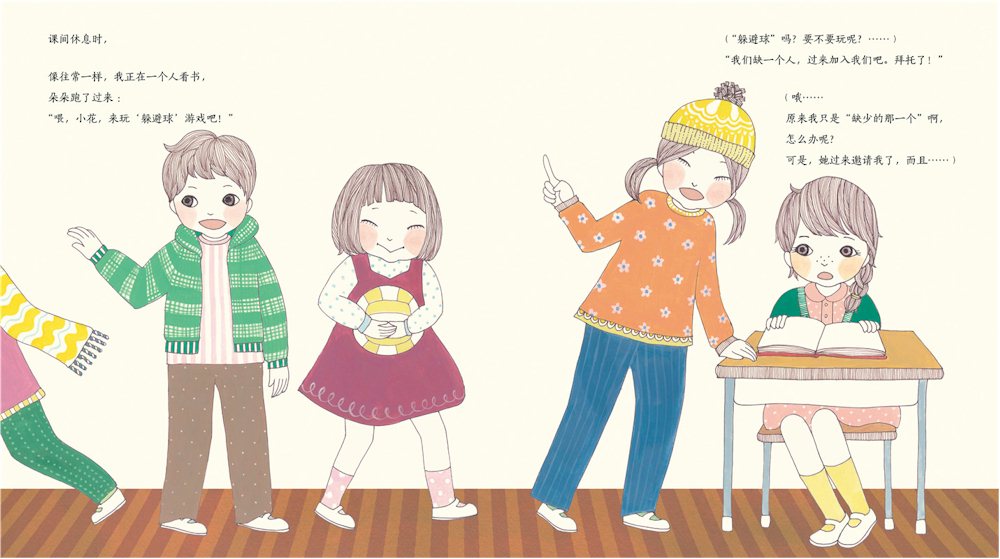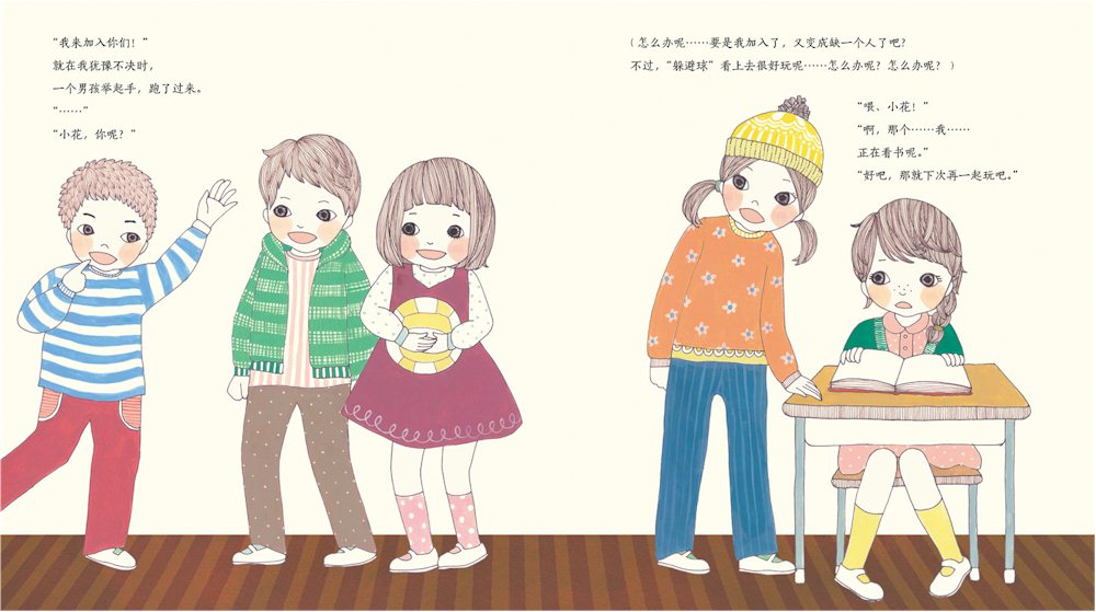 在《我不孤单》这个故事中,小花烦恼是:她喜欢自己看书,喜欢独处,但有时也想跟同学们交朋友、一起玩。这样的想法,要大声说出来,对于她来说,是一个很大的挑战。幸好,在摔倒这个生活小插曲中,小花经历了犹豫、失落、尴尬之后,终得到了大家的帮助,打开了心扉。