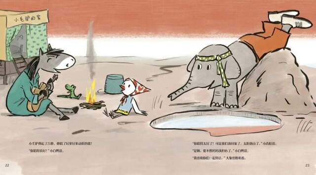 《去度假》:引导孩子知道与人交往要真诚,不要撒谎,更不能养成撒谎的坏习惯。小白鸭和小青蛙想试着说一次谎。她们先是和大象说要去山里度假,却不知如何找到山,只好将一个小土坡说成了山。大象不仅相信了他们,还帮她们挖了一座小山,并帮她们找来了水,把土坑变成了池塘。小白鸭、小青蛙和大象,一直玩儿到大家都感觉冷了。这时来了一头毛驴,他刚好捡了些木头,生起了篝火。夕阳下,大家坐在火堆旁,听毛驴弹吉他,唱歌……到了晚上,大家各自回家了。小白鸭向妈妈讲述了一天的美妙经历,妈妈夸奖了她的“度假”经历,却也告诉她,对别人说谎不好,以后不能随便撒谎。