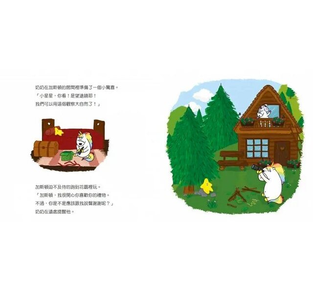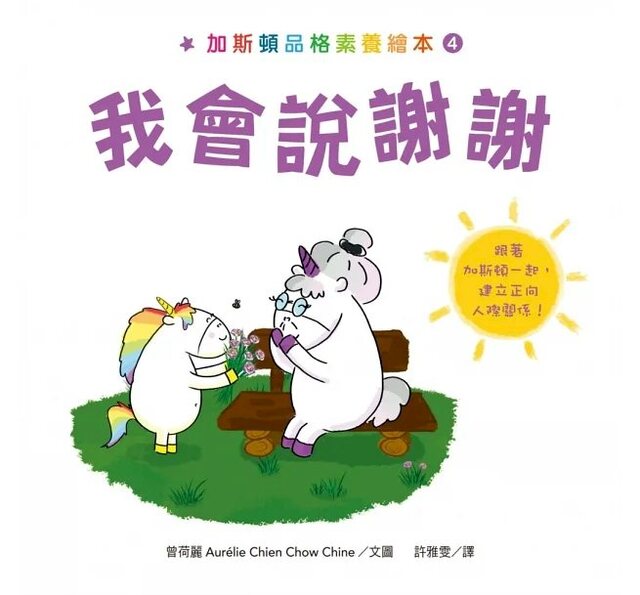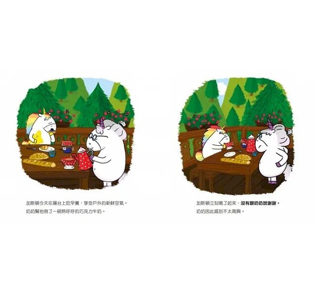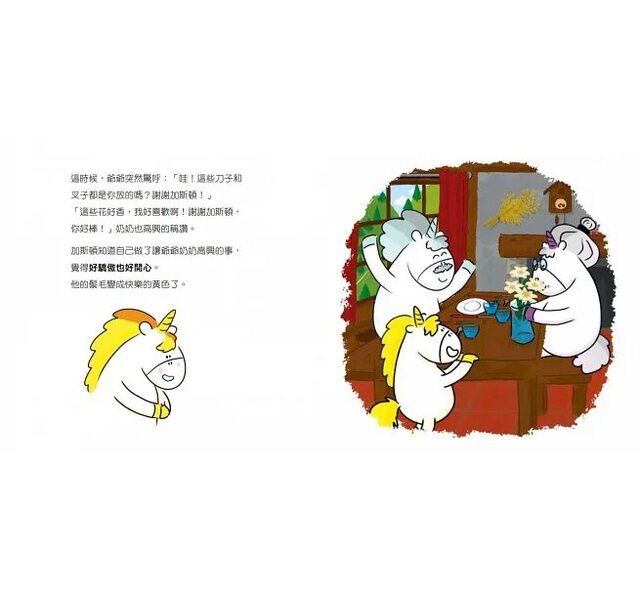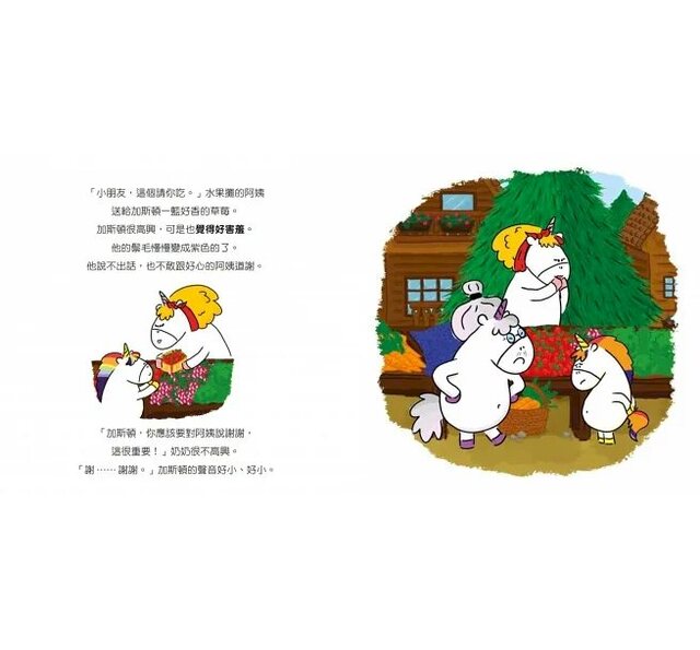 《我會說謝謝》快來跟加斯頓一起感受體貼別人的喜悅,養成好習慣!加斯頓的鬃毛會隨著心情改變顏色,而且他和你一樣,有時後會忘記說「謝謝」……加斯頓今天喝了奶奶準備的熱可可,卻忘記說謝謝;收到了鄰居叔叔送的蜂蜜,他急著回家和爺爺奶奶分享,也沒說謝謝。加斯頓想讓爺奶奶開心,所以主動幫忙擺刀叉,沒想到,爺爺奶奶因為忙著做菜,沒有注意到加絲頓特地準備的驚喜……加斯頓好失落,為什麼爺爺奶奶沒有對他說謝謝呢?失望的加斯頓可以怎麼辦呢?