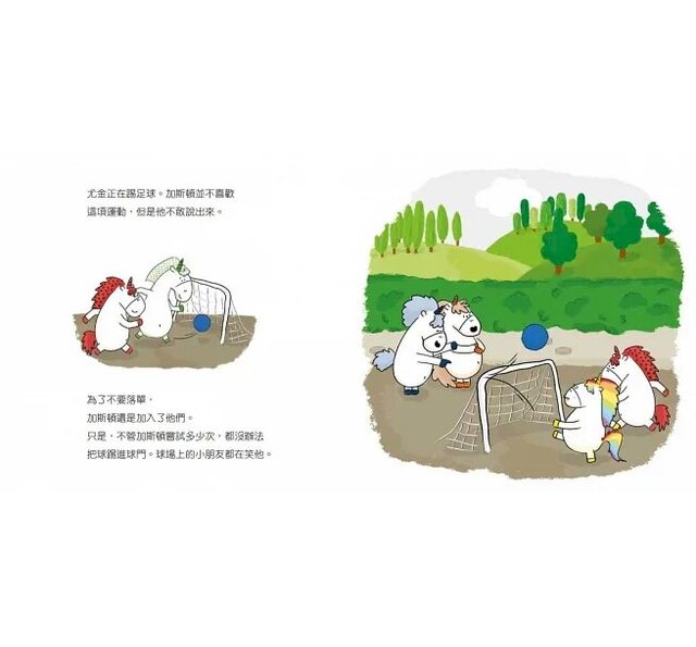 《輸贏都很棒》快來跟加斯頓一起面對挑戰,享受開心嘗試的滋味!加斯頓的鬃毛會隨著心情改變顏色,而且他和你一樣,玩遊戲不喜歡輸的感覺……加斯頓不喜歡踢足球,但是為了跟朋友一起玩,他還是勉強參加了遊戲。只是,不論加斯頓怎麼努力,就是無法射門得分!加斯頓一整天都悶悶不樂……沒想到回到家後,全家人玩遊戲他竟然又輸了!加斯頓又生氣又難過,有什麼方法可以讓加斯頓找回好心情呢?