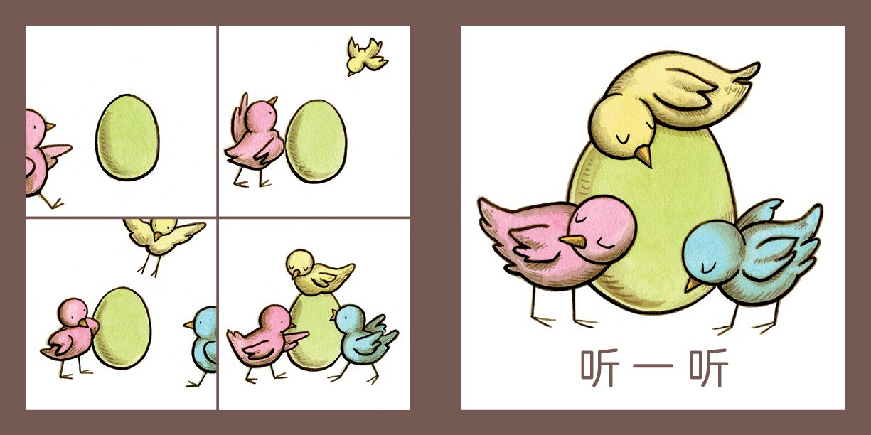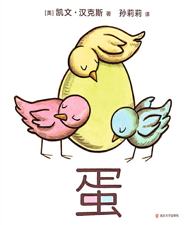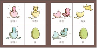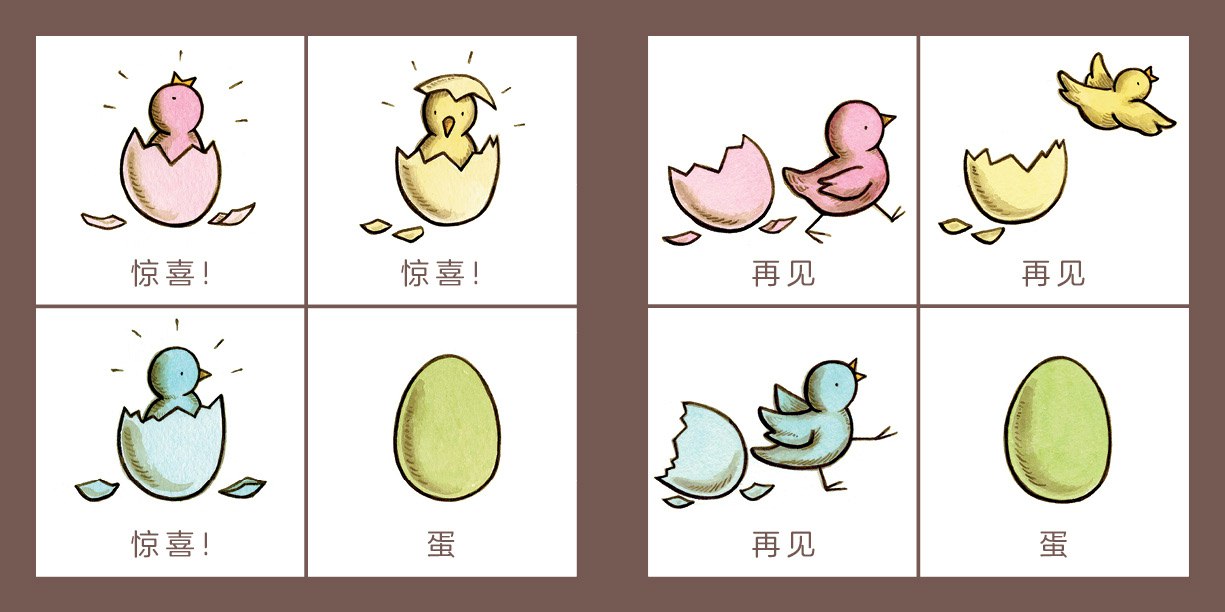 《蛋》:故事里有四颗蛋:一颗是蓝色的,一颗是粉色的,一颗是黄色的,还有一颗是绿色的。其中三颗蛋孵出来三只小鸟,小鸟们飞走了,只有绿色的蛋迟迟不见动静。三只小鸟又飞回来了。在小鸟们的帮助下,绿色的蛋终于裂开啦!然而意外的是,一只鳄鱼宝宝从蛋里钻了出来……《蛋》这本书用简短的词汇、漫画式的格子画面,讲述了一个以惊喜和悬疑为特色的故事,令人惊奇而惹人喜爱,是学龄前儿童早期阅读的完美之选,也非常适合课堂内小组阅读。