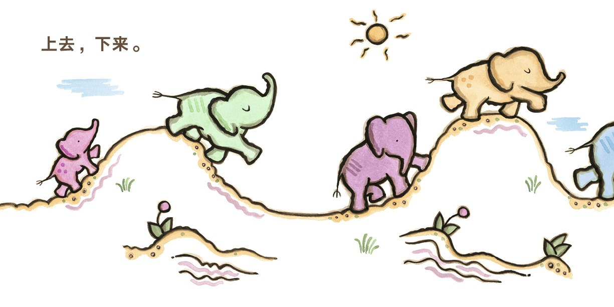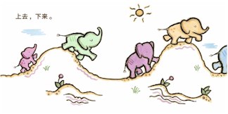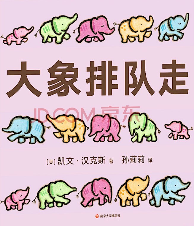 《大象排队走》:“上去,下来;上面,下面;进去,出来……”在凯迪克大奖得主凯文·汉克斯的这本图画书里,几只颜色各异的大象在排队前进。他们要去哪里?他们到达目的地后会做什么?故事结局有惊喜哟!富有节奏感的语言,明亮柔和的图画,大而易读的字体……凯文·汉克斯通过大象游行的故事,向小读者介绍了数字、形状、颜色、对立的概念,并设计了一个温暖而巧妙的结局,为小读者营造了安心入睡的故事氛围。