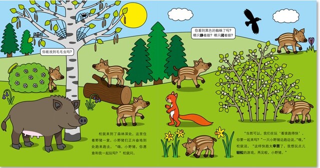 《春天的游戏》春天到了!树叶发芽了,美丽的花朵也盛开了。松鼠的心情很好,他想找个朋友陪他玩。松鼠去找小、小老鼠、小猪、金鱼 ......可是,他们玩的游戏都不适合松鼠。 ,松鼠找到和他一起玩的朋友了吗?另外,每一页中都有毛毛虫哦,找找看吧!