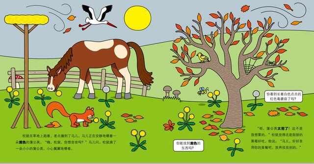 《秋天的味道》秋天到了!叶子从树上飘落下来,秋风凉飕飕的。松鼠从空心树中的小窝里跑了出来,他要找点儿东西吃。秋天有很多味道不同、颜色各异的食物,那么,松鼠和他的朋友们都吃什么呢?另外,每一页中都有红色毒蘑菇哦,找找看吧!