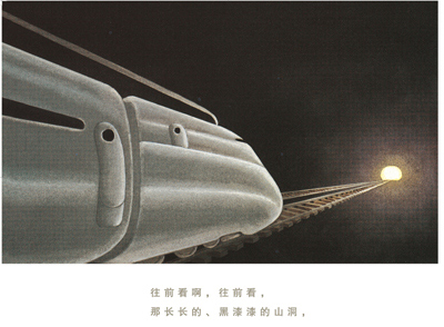 故事里有两列不同造型、行走不同路线的小火车。两列小火车中,一列是流线型的新火车,一列则是旧式老火车,分别在书里的左右页。爸妈除了以轻快的节奏念简洁的文字给孩子听以外,别忘了引领孩子一起阅读画面,激发对比和想象的能力。左页第一个画面,新火车沿着铁轨在“高架桥”下出发了,右页对应的是家中的高脚椅;左页新火车穿过城镇与乡村,右页对应的则是老火车开过有玩具熊、软皮球和风景图样的地毯。慢慢的,左页新火车过山洞了!瞧,右页老火车也在穿过书架成的山洞!夜深了,左页新火车在皎洁的月光照拂、满天的星斗陪衬下行进,右页的老火车则开到屋里的窗台边,一样看得到星星和月亮!左页新火车来到四周都是荆棘和仙人掌的沙漠,这时,你猜,右页的老火车到哪里了?家中厨房的扫帚和簸箕旁!