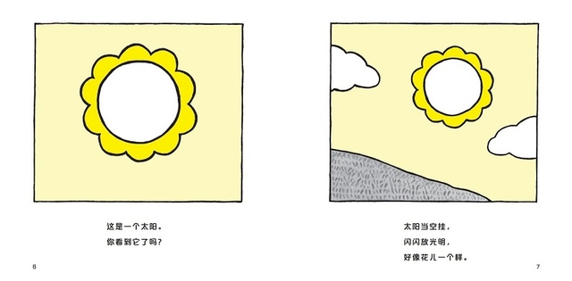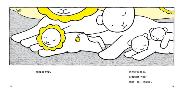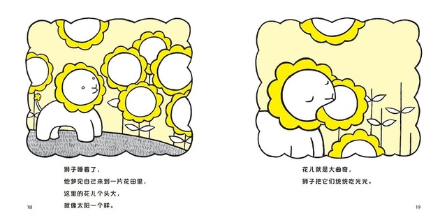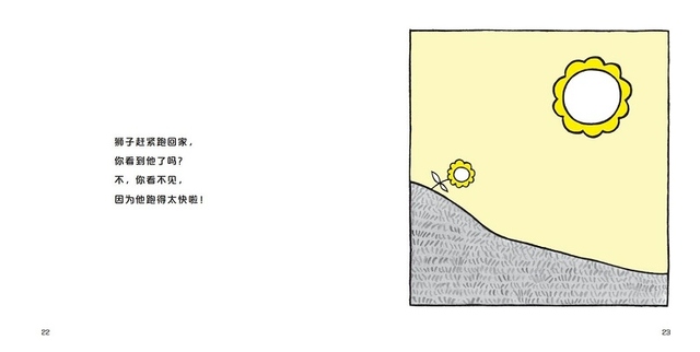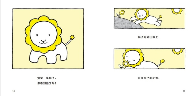 这是一本低幼认知绘本,讲述了太阳、花儿和一只小狮子的美丽相遇。山坡上阳光和煦,花儿开放,一只小狮子来到山坡玩耍,他躺在暖暖和和的阳光里睡着,梦到花儿变成了大曲奇……玩累了,睡饱了,肚子也饿了,小狮子飞快跑回家,吃了美味的晚餐,和家人依偎着进入梦乡。这本温馨幽默的绘本,传递给孩子温暖和快乐。三个角色,相似的形状,简单的颜色,启发孩子认知形状、颜色,寻找事物之间的相似性,为孩子们打开无尽的想象。简单的词汇和重复的句式,对0-3岁宝宝来说是很好的语言启蒙。