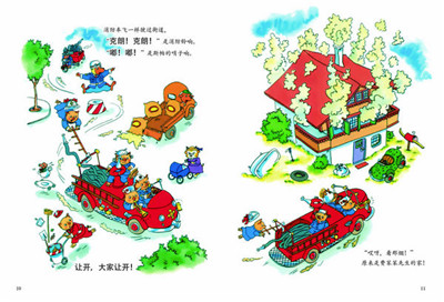 《东奔西跑的消防员》: 消防员们东奔西跑好忙啊!他们救下了树上的小猪,从浴缸里捞起了费笨笨先生,冲散了绿蚁家庭的烧烤会——费笨笨先生,你报错火警啦。