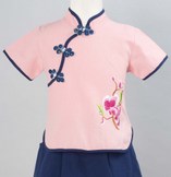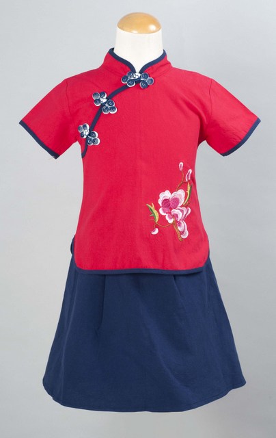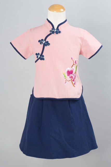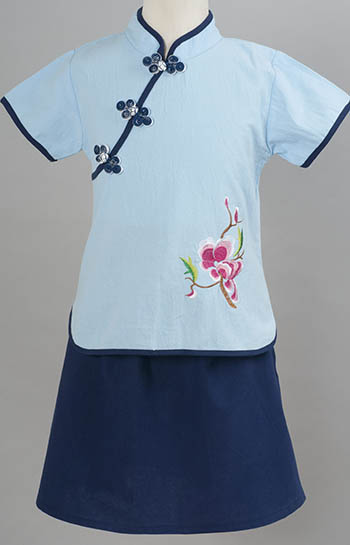 This comfortable shirt and skirt set is designed with embroidered flowers at bottom and embroidered frog buttons on the top along with Mandarin collar.