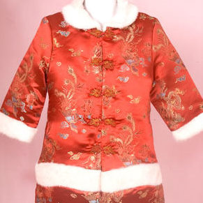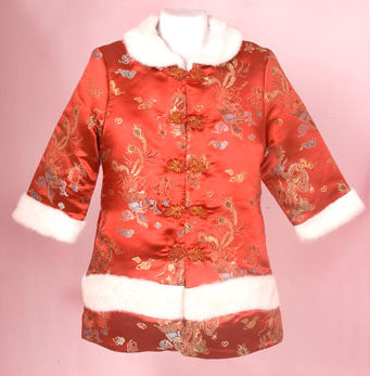 This beautiful girl's jacket is designed with bright red phoenix brocade. Trimmed around the cuffs and below the waist with white fake fur, the cozy jacket is finished with stylish frog buttons. A great outfit for a Chinese New Year party or any special occasion. Perfect for cold winter and early spring months! Please note these are American sizes, e.g. Size 2 fits an average 2 year old.