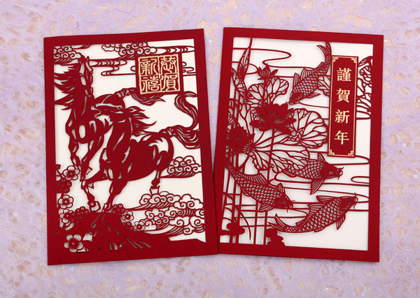 Share happiness and good wishes for the coming year by sending these beautiful greeting cards. Designed in papercut format, one card features two running horses and the other card features fish, the symbol of prosperity, and the Chinese characters Jin He xin Nian - Happy New Year.