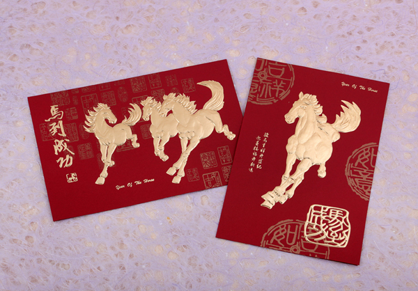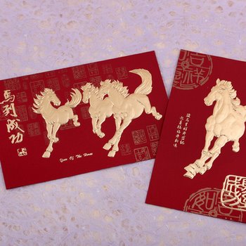 These New Year cards celebrate the beauty of Chinese culture. One card features a gold plated image of a Horse for celebrating Year of the Horse, with the Chinese "骏马呈祥开盛纪,迎春接福开新运"--"Jun Ma Cheng Xiang Kai Sheng Ji, Ying Chun Jie Fu Kai Xin Yun" , meaning good luck in the new year. Another card features a gold plated image of three horses,with the Chinese characters of Ma Dao Cheng Gong - Gain Success in a Speedy. Envelope included.
